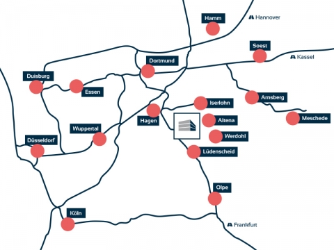 Die Autobahn A45 ist als zentrale Verkehrsader die direkte Verbindung in das Ruhrgebiet, das Rheinland und den Frankfurter Raum. Zahlreiche Anschlussmöglichkeiten erlauben den schnellen Transport in das gesamte Bundesgebiet und die Nachbarländer. Auch die Nähe zu den Flughäfen Köln/Bonn, Düsseldorf, Dortmund und Frankfurt spricht für diesen Standort.